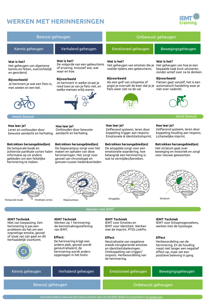 Bij IEMT gaan we voorbij aan het feiten geheugen. We werken met het emotionele geheugen om op een diepere laag, bij het gevoel van meer onbewuste herinneringen uit te komen. Het moment waarop een koppeling is gevormd tussen zintuiglijk input uit de omgeving (horen, zien, proeven, ruiken, voelen) en een reactie in het lichaam.
